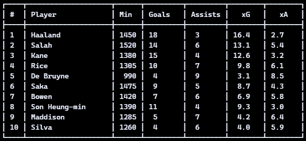 - Top-right: dual threats (high xG/90, high xA/90)- Bottom-right: pure finishers (high xG/90, low xA/90)