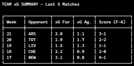 - Sample Expected Goals Summary: